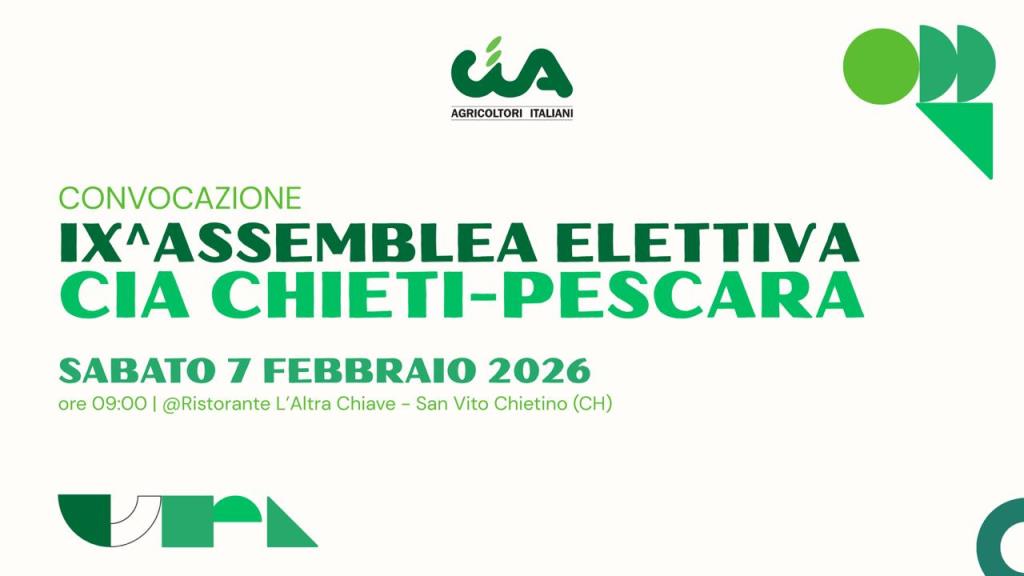 È convocata la IX Assemblea Elettiva Provinciale CIA Chieti-Pescara per il rinnovo degli organismi provinciali e l’elezione del Presidente.